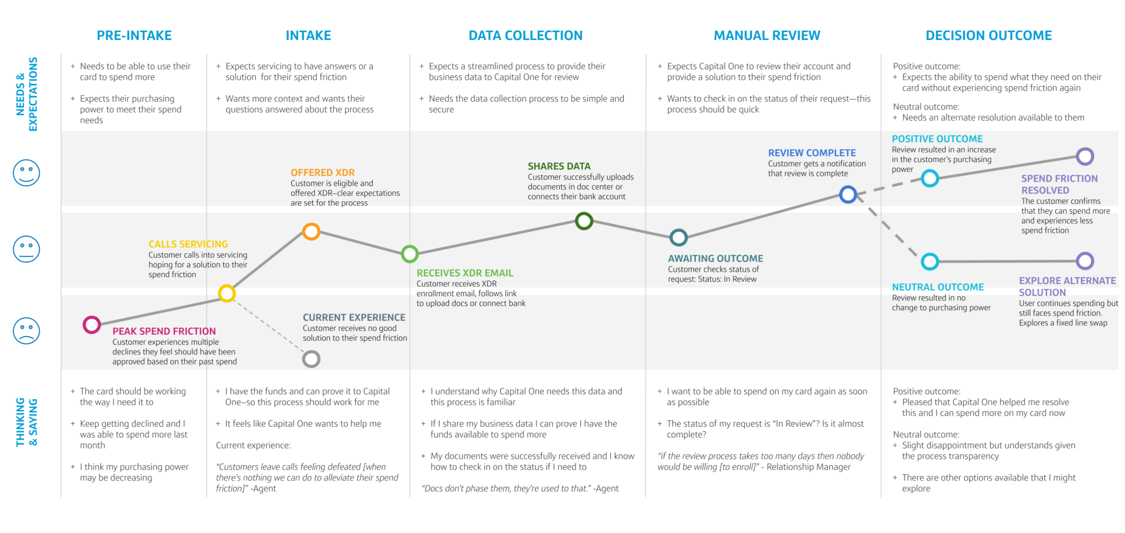 Based on the agent research, I worked on mapping out the ideal customer journey, highlighting a customer’s needs and expectations throughout each step of the proposed journey, as well as their thought process. This highlighted the impact that Expanded Decline Resolution could have on the customer, given the transparency of the process.