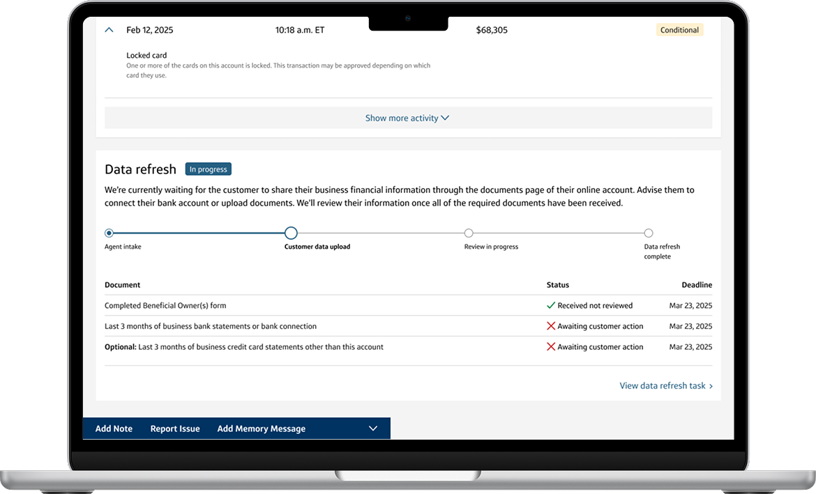 Unexpected declines frustrate high-spending customers and can push their spending to competitors. To address this, we introduced a way for customers to share additional financial context, enabling more confident decisions while improving spending flexibility and customer trust. This experience also gave agents clearer guidance when supporting customers to better meet their needs.